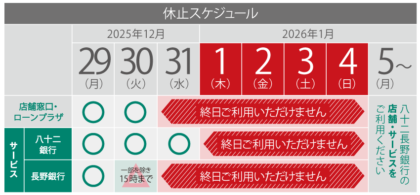 各種サービスの一時休止等について(八十二銀行に口座をお持ちのお客さま)各種サービスの一時休止等について(長野銀行に口座をお持ちのお客さま)