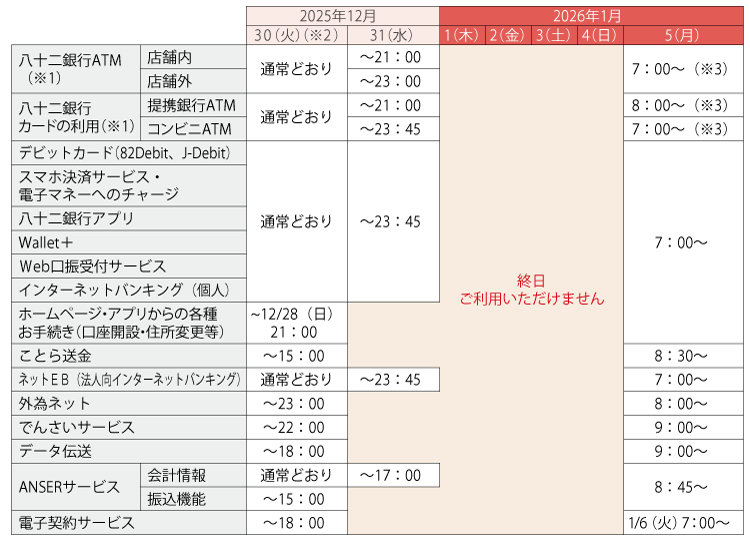 八十二銀行カードの利用(※1) | 提携銀行ATM | 通常どおり | ~21:00 | 8:00~(※3) | ||||