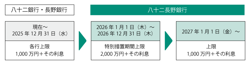 合併後、1年間(2026年1月1日(木)~12月31日(木))は特例措置期間として、預金者1人当たりの元本2,000万円と破綻日までのその利息が保護されます。