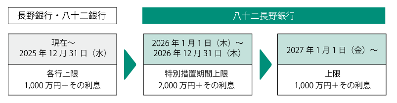 合併後、1年間(2026年1月1日(木)~12月31日(木))は特例措置期間として、預金者1人当たりの元本2,000万円と破綻日までのその利息が保護されます。