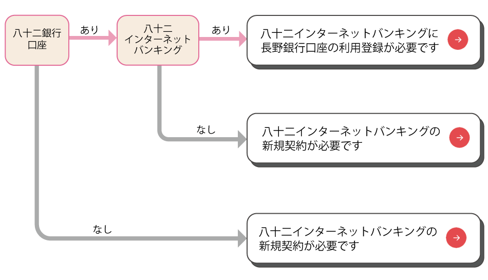 八十二銀行とのご契約状況により、お手続きが異なりますので、以下のフロー図に沿ってお手続きをお願いいたします。