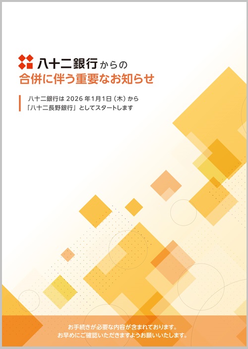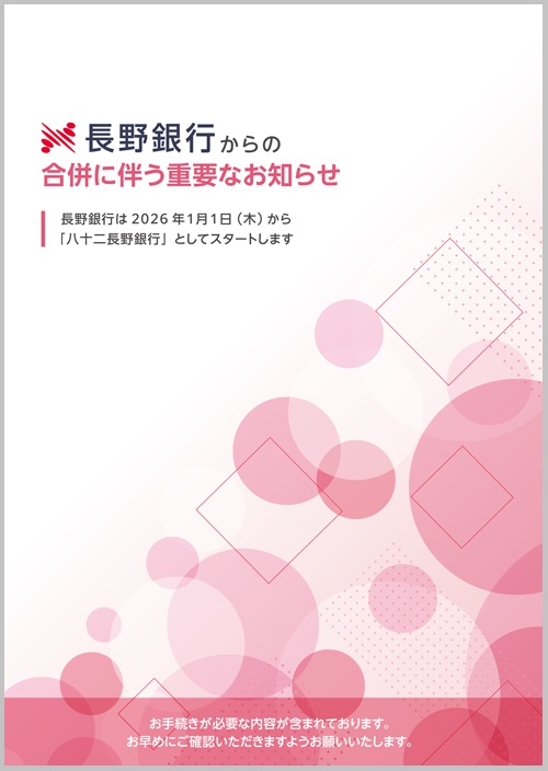 - 「合併に伴う重要なお知らせ」は、八十二銀行または長野銀行に預金・融資取引等のあるお客さまへ、各行からお送りいたします。