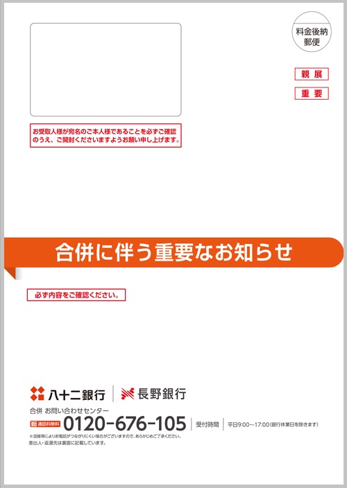 八十二銀行および長野銀行とお取引きいただいているお客さまに「合併に伴う重要なお知らせ」を順次発送しております。